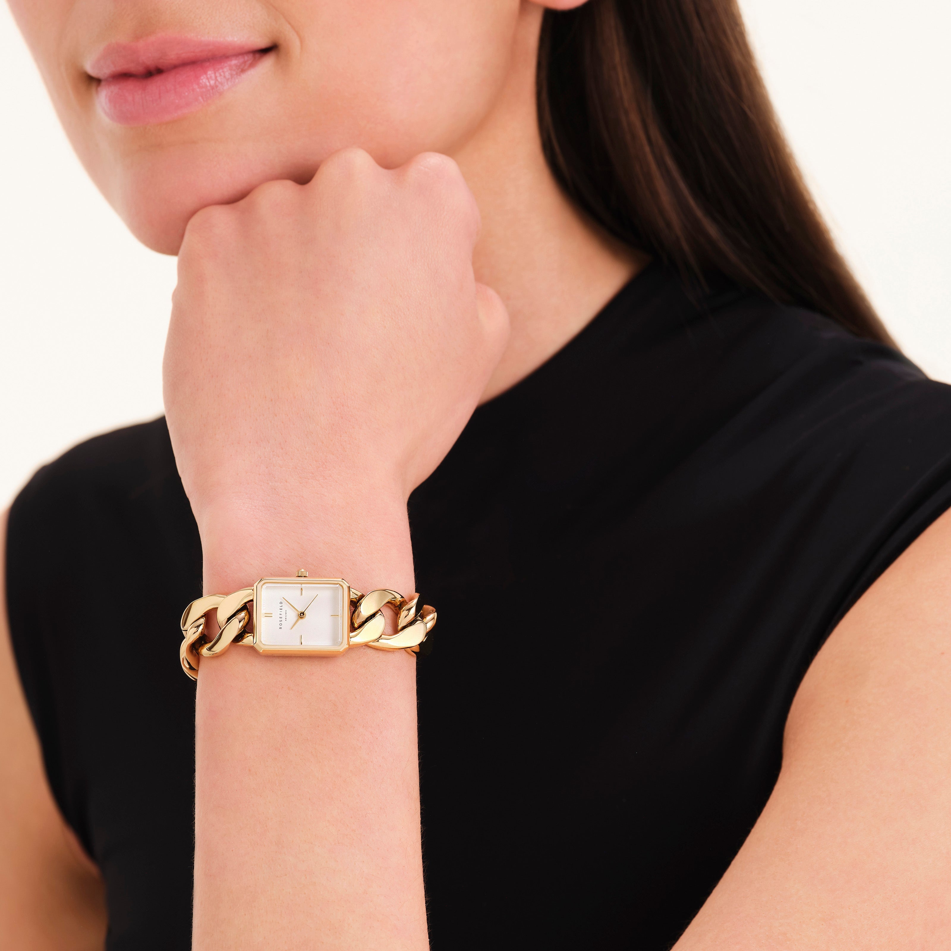 Rosefield Studio introduces a new range of watch & jewelry combinations - unique pieces with a premium look. We reinvented our popular Octagon Watch to a more petite size, with a high-shine polished flat curb chain. The chain closes with a Rosefield engraved T-bar closure that locks into the O-ring and is easy to adjust to fit every wrist.